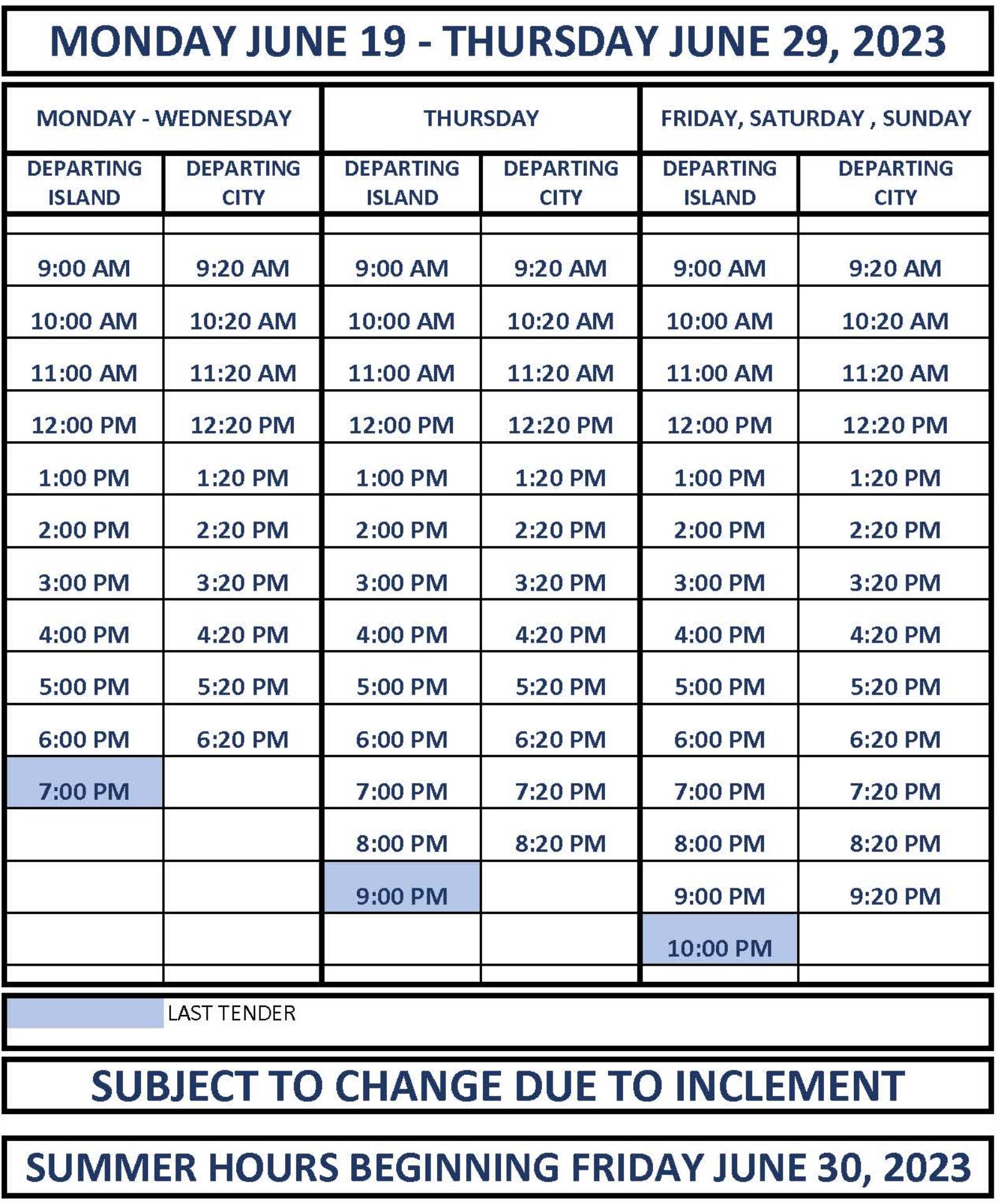 Tender Schedule – June 19-29 2023